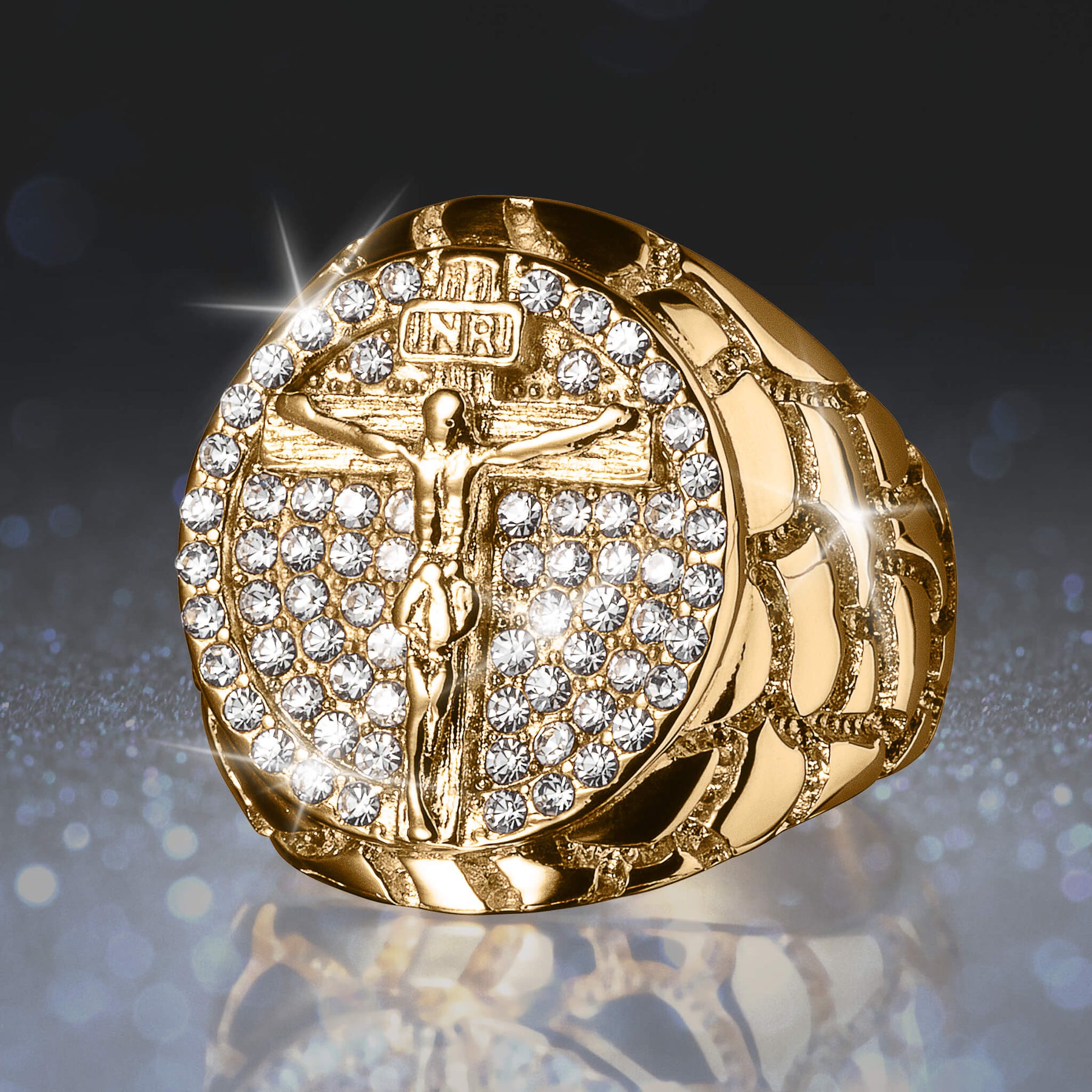 An exquisite piece that is a testament to faith and devotion. Crafted from premium grade stainless steel with a luxurious golden finish. Set with shimmering Diamondeau®, flawless simulated diamond. A golden crucifix, with intricate detailing is the centrepiece of this ring. Whether you wear this as a symbol of faith or as a fashion statement, this ring is sure to make a bold and impactful statement.