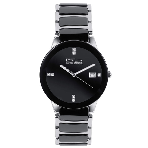 The black dial serves as a refined canvas, showcasing the details that make this watch unique. The deep black backdrop provides a striking contrast for the 7 Diamondeau® stones—flawless simulated diamonds precisely set at the 12, 3, 6, and 9 o’clock positions. These Diamondeau® stones add a touch of luxury without overpowering the watch’s sleek design, creating a sophisticated sparkle that catches the light elegantly. Each stone is meticulously set to ensure it remains secure, adding both beauty and resilience to the timepiece.