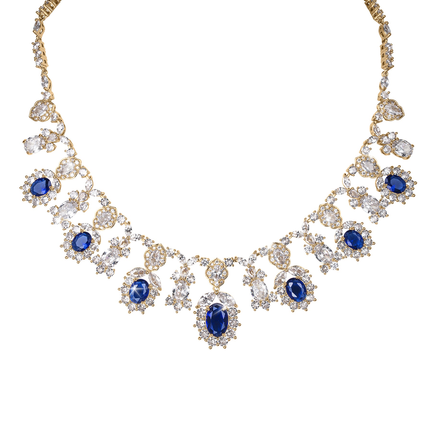 Inspired by one of the most iconic engagement rings in history, this exquisite necklace captures the timeless elegance and refined glamor of Princess Diana’s royal jewel. Her celebrated engagement ring featured a striking 12 carat oval blue Sapphire, encircled by 14 diamonds, a design that captivated the world with its regal beauty. Now worn by Catherine, Princess of Wales, the ring continues to symbolize enduring love and royal legacy. Finished in radiant yellow gold, this sophisticated necklace showcases a rich blue oval Diamondeau®, flawless simulated diamond, surrounded by a dazzling halo of white gems, expertly cut in a variety of shapes. Elegant, expressive, and undeniably regal, this necklace is a tribute to timeless sophistication. Whether worn for a momentous celebration or a cherished evening affair, it brings a touch of heritage-inspired glamor to any ensemble.