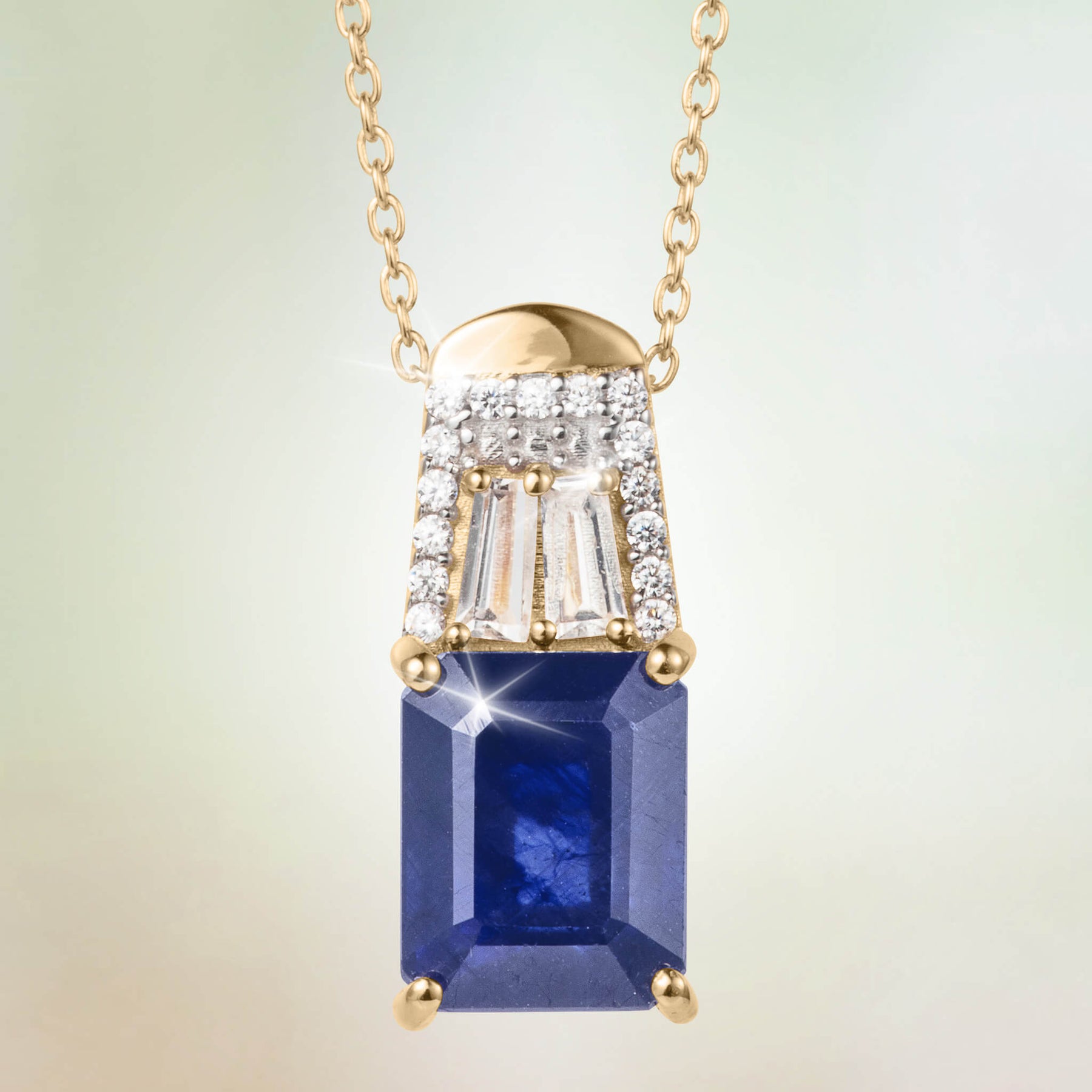 Step into the glamor of a bygone era with this stunning pendant. Crafted in sterling silver and lavishly finished in 18k yellow gold, it showcases a striking emerald-cut Created Sapphire, its deep blue hue radiating with graceful intensity. Created Sapphires offer the same mesmerizing color and durability as natural gemstones, but with exceptional value, giving you the look of high-end luxury for a fraction of the cost. Surrounding the center stone is an intricately arranged cluster of Diamondeau®, flawless simulated diamond, with the clean lines of baguette cuts and the soft brilliance of round stones coming together in harmony. The resulting silhouette is unmistakably inspired by the bold geometry of the Art Deco era, capturing the elegance of a golden age with a distinctly modern sensibility.