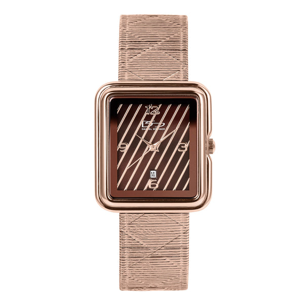 A study in elegance and craftsmanship, this timepiece is made to dazzle with every detail. Sleek, sculpted, and undeniably stylish; the textured strap is the showstopper here. A warm rose gold tone mesh, artfully etched in a diamond-like pattern known as cannage—this iconic geometric weave has long been associated with Parisian couture, symbolizing refinement, craftsmanship, and timeless design. It catches the light like fine jewelry and moves like woven silk, wrapping the wrist in comfort and undeniable sophistication. This textured brilliance flows effortlessly into a sleek rectangular case, where a diagonally striped chocolate brown dial echoes the motif of the strap. With its minimal yet striking rose gold tone hands, clear numerals, and a neatly positioned date window, this timepiece is equal parts fashion statement and modern classic.