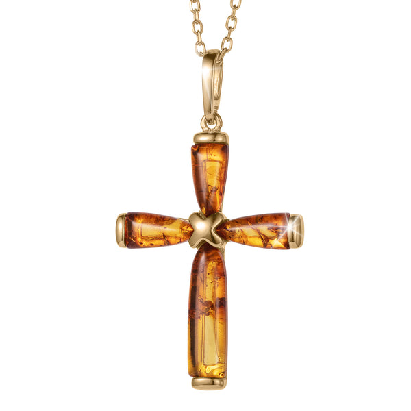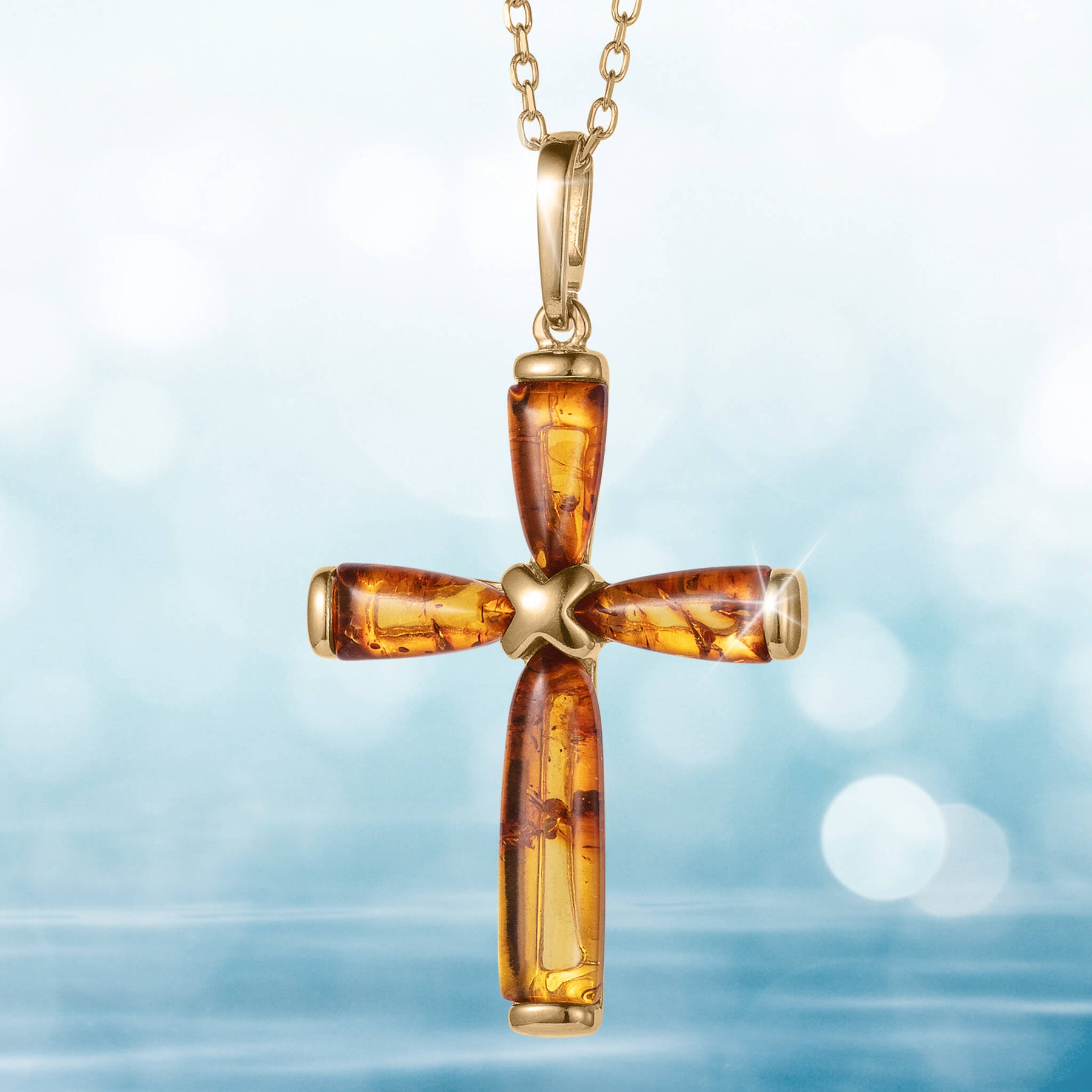Crafted in radiant sterling silver with a soft yellow gold finish, this pendant glows with the gentle warmth of genuine Baltic Amber. Each piece of Amber is unique, its honeyed hues and subtle inclusions telling a story millions of years in the making. Formed from ancient tree resin and preserved by time, Baltic Amber carries within it the energy of sun, sea, and forest. The golden cross design blends natural beauty with quiet elegance, creating a timeless symbol of light and renewal.