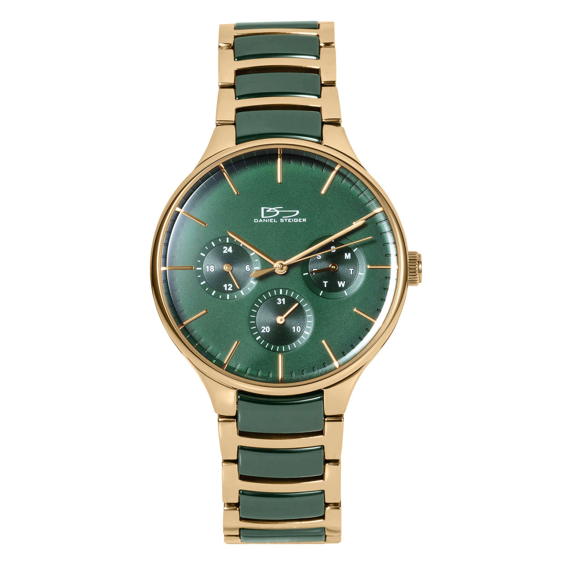 Bold, sophisticated, and built to impress, this men’s timepiece redefines modern luxury. The strap showcases a bold design that unites gold tone stainless steel with rich green ceramic in every link. This seamless fusion of materials creates a striking contrast; polished gold and deep green working in perfect balance to symbolize strength and refinement. The dial continues this commanding look with matching green, accented by gold toned hour markers, hands, and three functional sub dials that track day, date, and 24-hour time with precision. Every detail is engineered for both practicality and impact, ensuring this watch performs as impressively as it looks. Built to stand out, this is timekeeping redefined for the man who refuses to blend in.