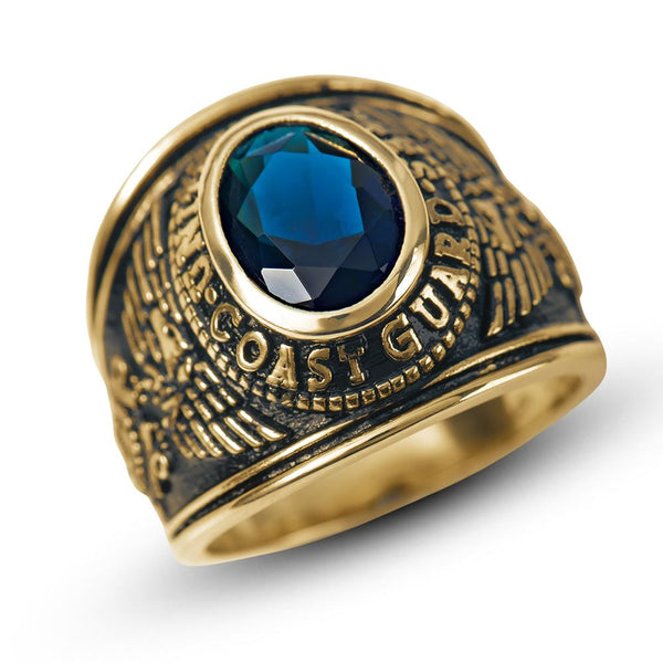 This impressive men's ring is the perfect gift or purchase for any member of the Coast Guard. Crafted with care and attention to detail from solid 925 Sterling Silver and lavishly plated with an antique gold finish. Each ring is set with a 2 carat deep blue Diamondeau® - flawless simulated diamond. Each ring dispatches in one of our magnificent presentation cases, perfect for gift giving.