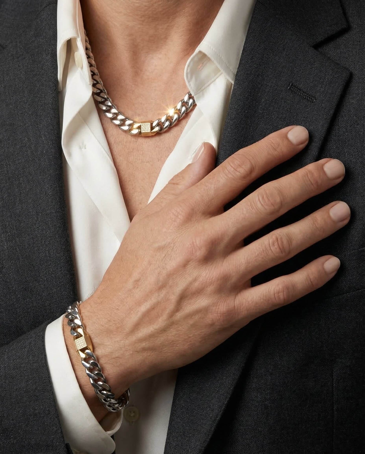 Make a statement without saying a word. This men’s two-tone stainless steel bracelet combines bold curb links with striking gold tone accents for a powerful, modern look. Precision crafted in high polish stainless steel, this piece is built for durability, weight, and everyday wear. Gold tone stations punctuate the design, set with rows of sparkling Diamondeau®, flawless simulated diamond that catch the light from every angle. The contrast of cool steel and warm gold creates a sharp, confident finish that stands out whether worn solo or layered.