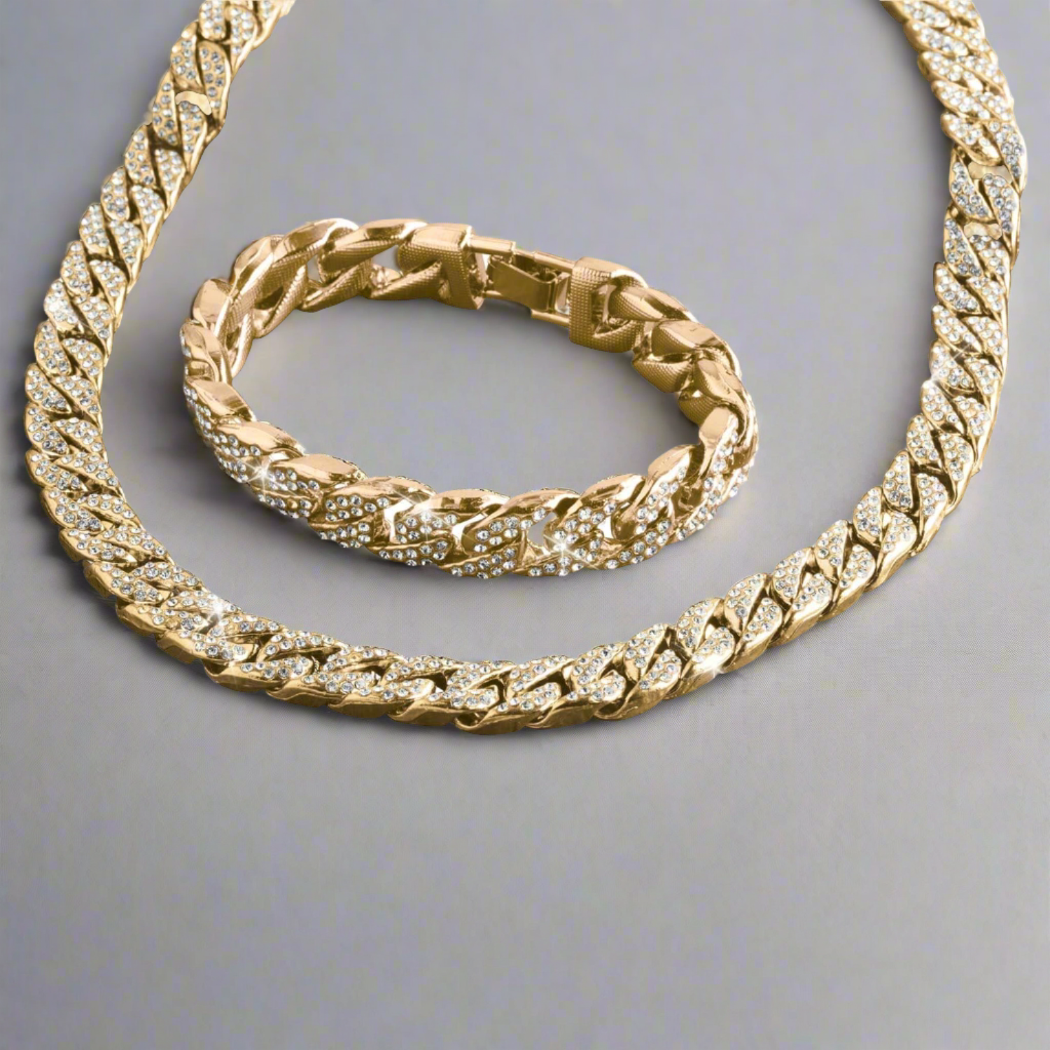 This casual, yet classic luxurious men's curb necklace and bracelet collection is the perfect companion to many of our designer timepieces. Set with over 1000 sparkling crystals, this set is sure to make a statement.