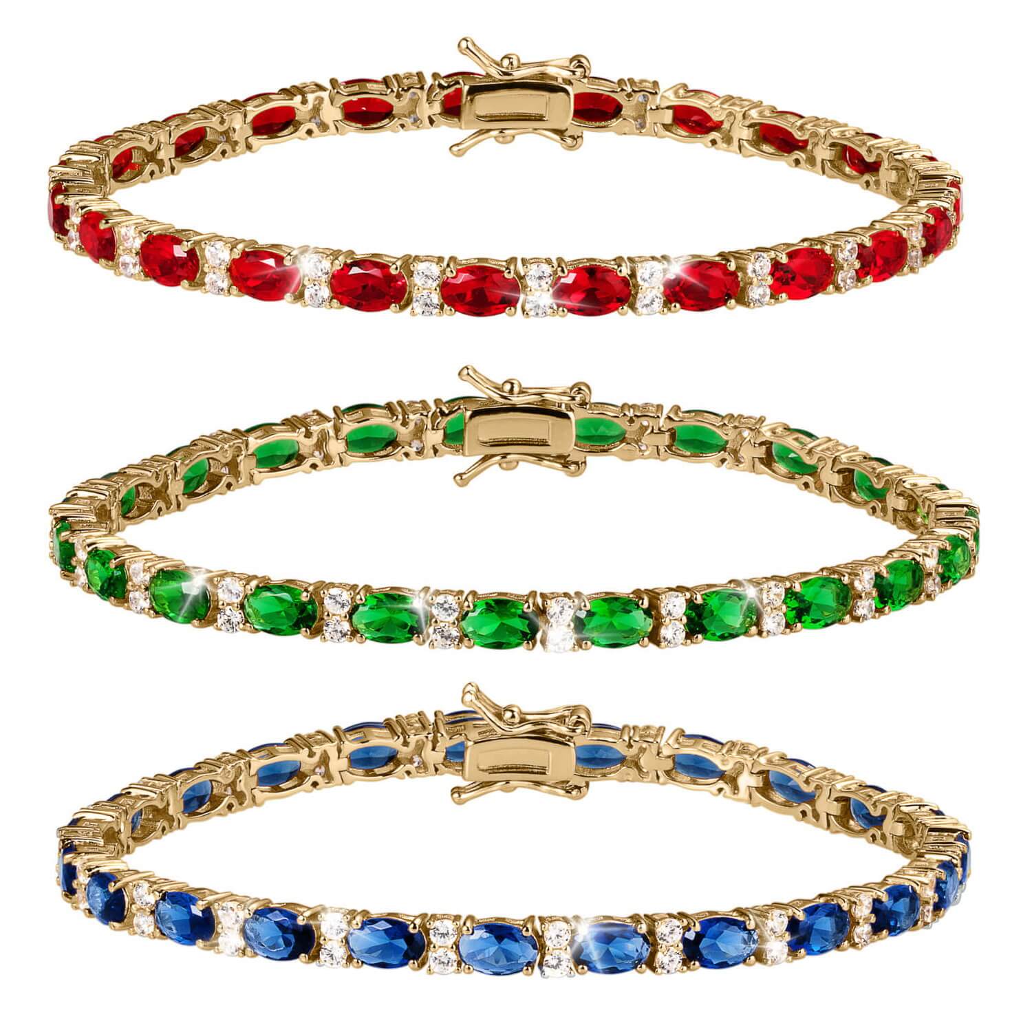 Glittering and incredibly glamorous, this gorgeous trio of bracelets features shimmering oval fiery red, midnight blue or evergreen gems with alternate shimmering ice white Diamondeau®, flawless simulated diamond. Fashioned from sterling silver, gloriously plated in golden yellow gold. The ideal accessory for the party season.