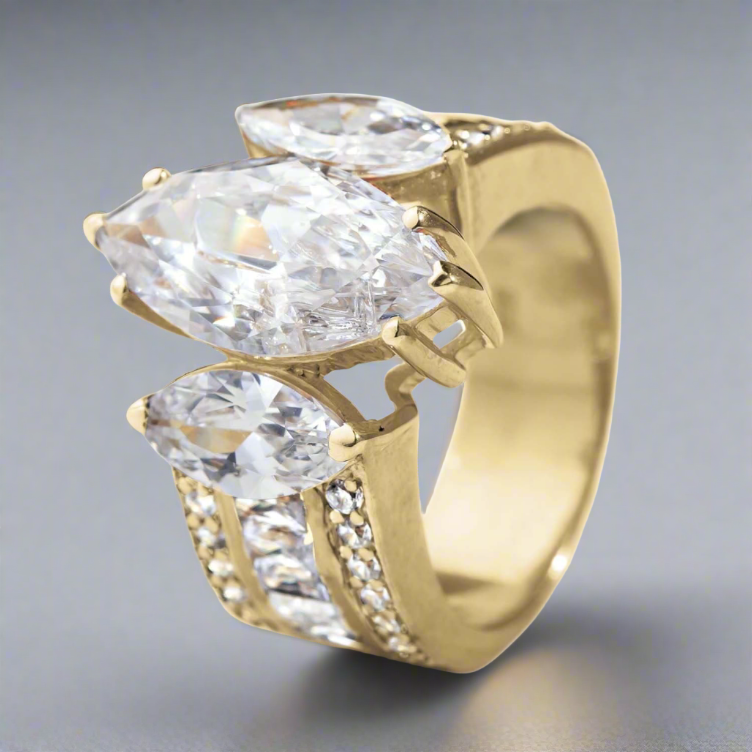 The marquise cut is an impressive cut with plenty of history . The name “marquise” refers to a hereditary rank above a count but below a duke and comes from courtiers wearing marquise cut diamonds in order to show off their rank. Marquise cut gems are also often referred to as “navette”, which means “little ship” in French, because of the marquise’ boat-like shape. We have set a stunning 14.09ct of marquise cut Daniel Steiger created Diamondeau®, our exclusive substitute for natural diamond in the center. A truly impressive statement trilogy ring.