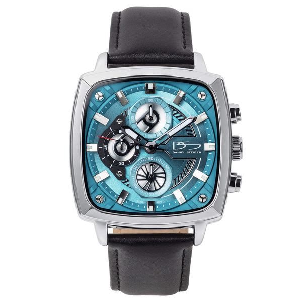 A sleek black leather strap with subtle stitch detailing adds a refined touch, seamlessly complementing the watch’s bold square case. The standout feature of this timepiece is the striking chronograph dial in teal. Each dial is intricately designed to capture attention, making it as much a statement of style as it is a tool for precision. Whether you’re in a business meeting or enjoying a casual day out this watch ensures you’re always on time and always turning heads.