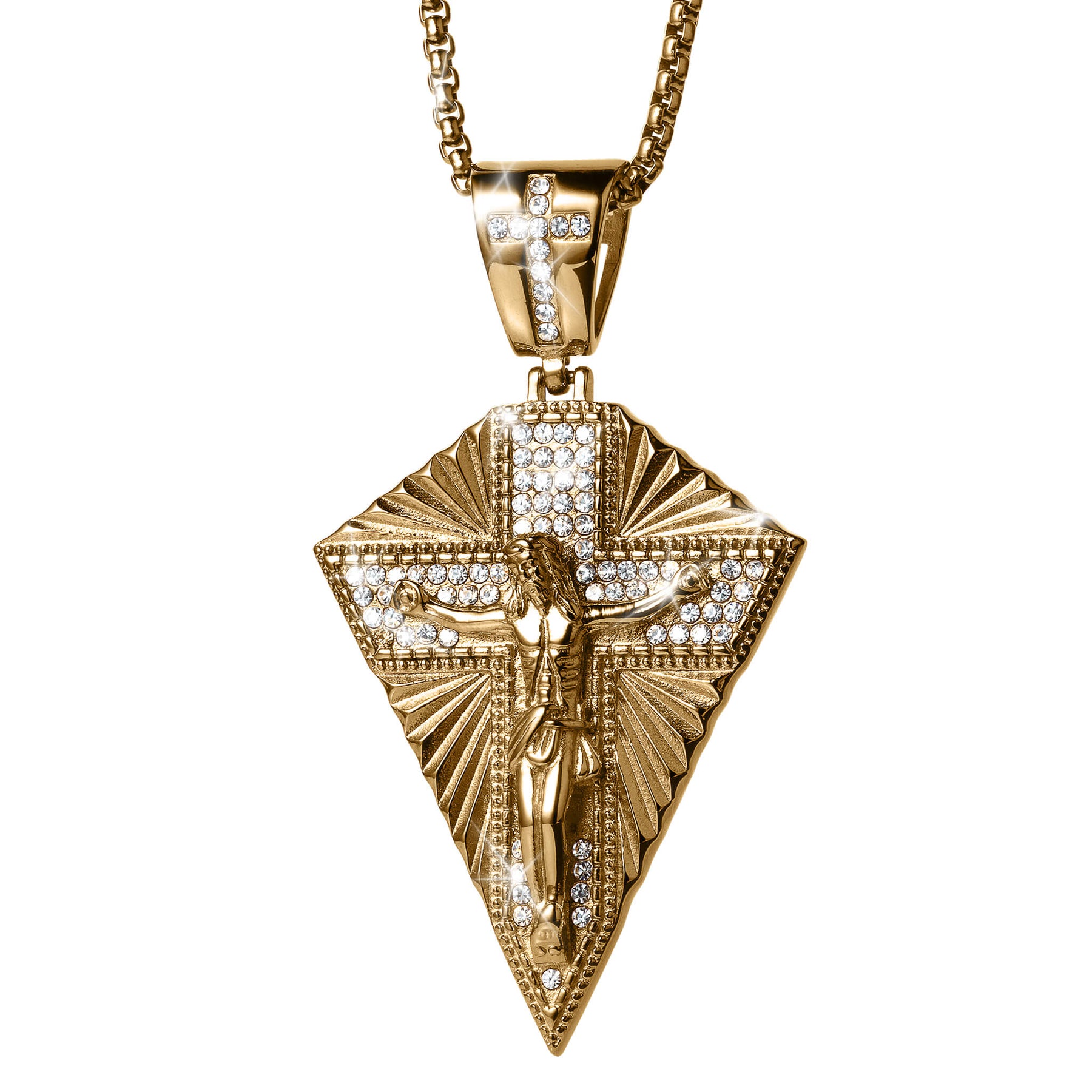 A stunning shield mount expertly crafted from premium grade stainless steel, finished in yellow gold has as a centerpiece a beautifully detailed engraving of the classic crucifix. Our shimmering Diamondeau®, flawless simulated diamond, accentuate and glow with rich, lustrous shine. An excellent Christian medal for men, it makes a thoughtful gift to give a loved one or as a reminder to the wearer of Christ's sacrifice.