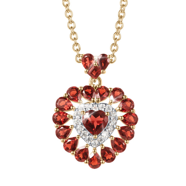 This pendant is more than just jewelry, it’s a symbol of your affection making it the perfect gift for the one you love. Finely crafted from sterling silver, finished in 18k yellow gold. The heart shaped frame is set with Garnets and white Diamondeau®, flawless simulated diamond. The Garnets deep, rich hues symbolize passion and love, while the white shimmering gems, adds a touch of brilliance and sparkle. This pendant is destined to become a cherished symbol of love and devotion.