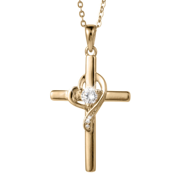 A beautiful symbol of faith and love. Crafted in sterling silver and finished in radiant yellow gold. The design features a heartfelt embrace – a delicate heart gracefully wrapped around the cross.  Sparkling Diamondeau®, flawless simulated diamond stones are set within the heart, adding a touch of brilliance and elegance. A timeless piece that blends faith with femininity, this cross is perfect for everyday wear or as a meaningful gift to someone special.