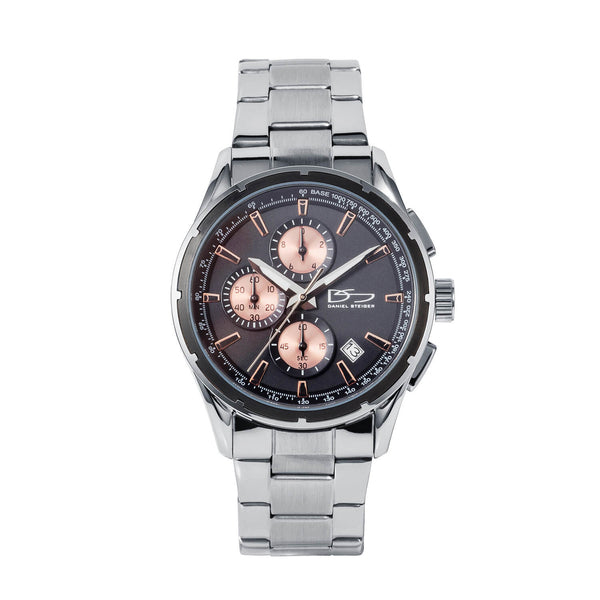 Not too much and not too little, our Elevation watch is just the right blend of comfort and style all rolled into one. A black dial has a useful date window and 3 chronograph sub dials, 1/10th seconds, seconds and minutes in a rose gold finish, with rose gold indices.