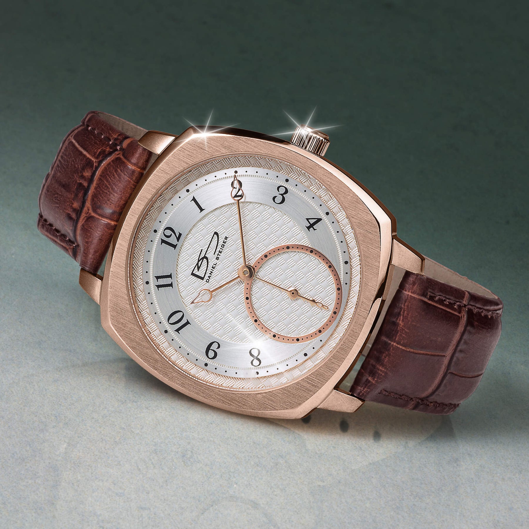 These watches have it all! Starting with the case we have used only the best stainless steel. A bezel in steel or fused with IP rose gold has been given a mixture of matte and polished finishes. A textured cross hatch dial with a two hand movement and second hand sub dial gives an elegant but classic feel. A genuine croc leather strap in brown completes this timepiece.