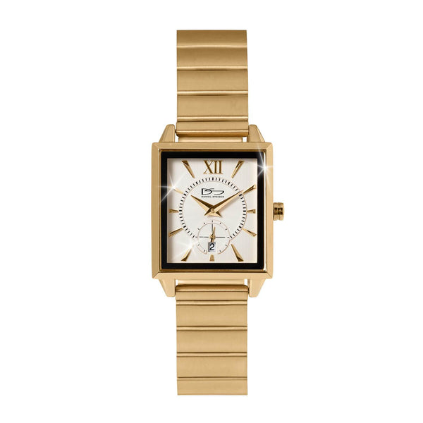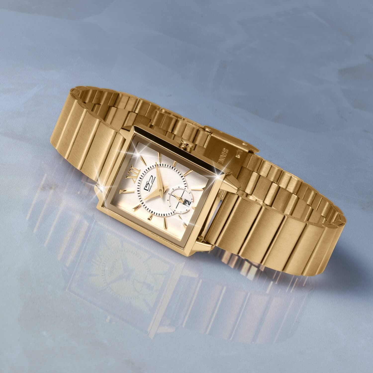 Our Quadro watches have a sleek square case. The mixture of textures brushed and polished finishes on the case and strap, help make this sophisticated pair of watches look really luxurious. A useful date window and second hand sub dial add to this sleek designer finish. The hardest choice you have is to decide which color you want, your choice of golden finish or midnight black and rose.
