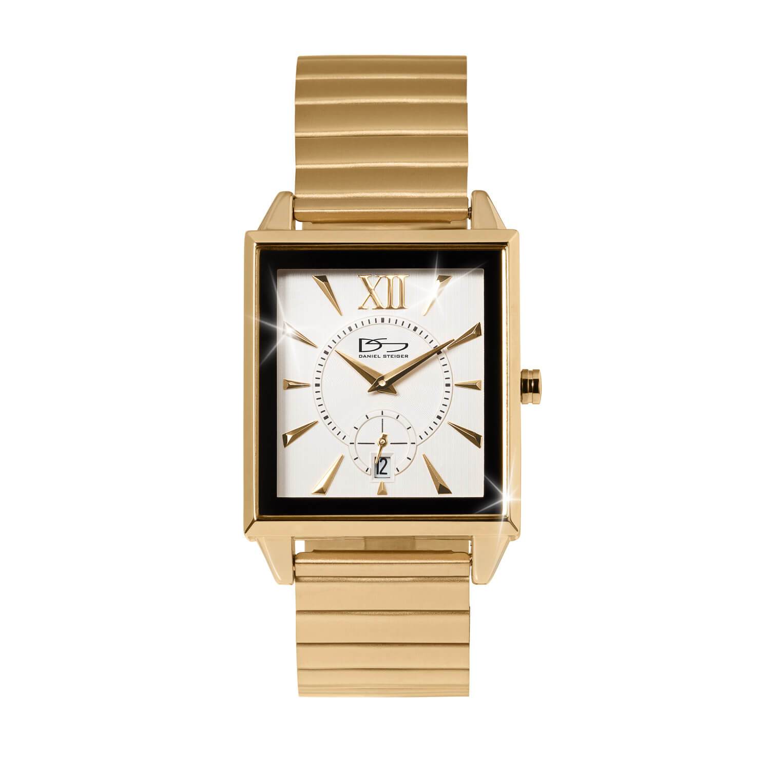 Our Quadro watches have a sleek square case. The mixture of textures brushed and polished finishes on the case and strap, help make this sophisticated pair of watches look really luxurious. A useful date window and second hand sub dial add to this sleek designer finish.