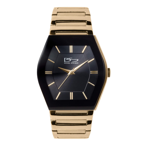 Where timeless elegance meets modern sophistication. The golden, classic steel bracelet strap exudes refined luxury, leading to a fancy, hexagonal shaped case accented with a sleek black mirrored edge. A captivating black sunray dial contrasts against the golden indices, adding a touch of boldness and character to the watch’s overall aesthetic. This unique design is sure to catch the eye and make you stand out from the crowd.
