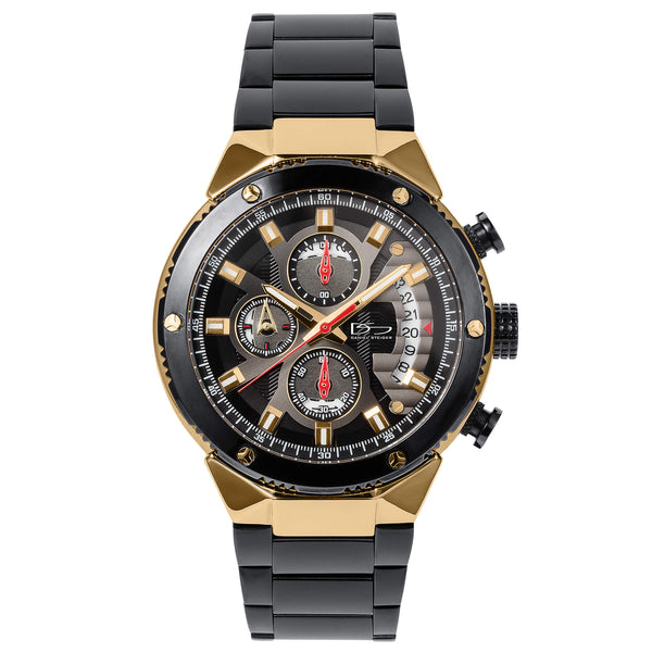 A sophisticated timepiece that seamlessly marries timeless design with stylized functionality. A classic black stainless steel strap that exerts an understated elegance, making it a versatile accessory for every occasion. The bold design of the watch is accentuated by a black and yellow gold case, adding a touch of luxury. A sophisticated chronograph movement, brings precision and functionality to the forefront. With the dial, featuring intricate detailing that elevates its visual appeal. A handy date window ensures that you stay organized and punctual in style. A statement piece that reflects your discerning taste.