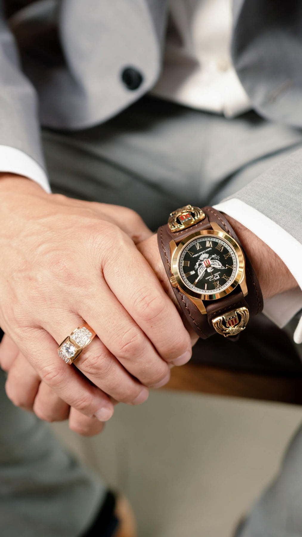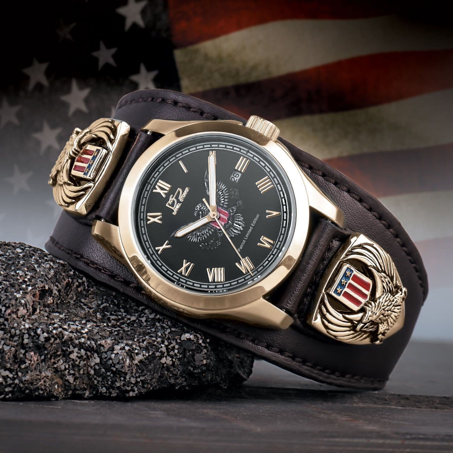 Every detail of the Patriot Watch has been meticulously engineered for superior quality. Each solid stainless steel component is expertly fused with luxurious 18K gold, creating a striking blend of strength and sophistication. The genuine leather cuff-style strap not only provides comfort but also enhances the bold, commanding presence of this timepiece. Adorned with two medallions featuring the iconic American Eagle and flag detailing in rich enamel, this watch is a true work of craftsmanship that stands the test of time.