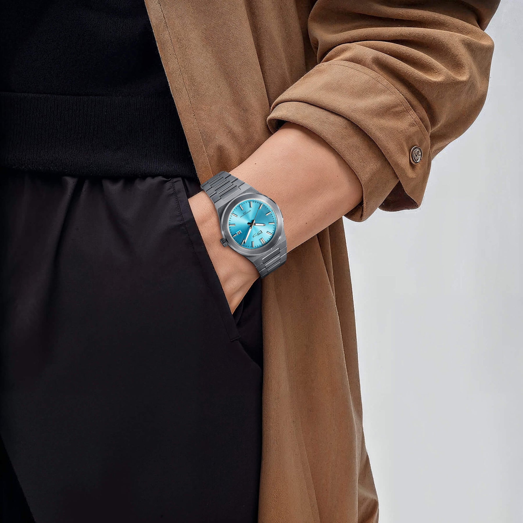 A timepiece that effortlessly balances style and functionality. Crafted with precision, this watch features a tapered stainless steel band with a brushed finish that exudes modern sophistication. The stainless steel case complements the band seamlessly, showcasing the attention to detail. The standout feature of this watch is its captivating light blue sunray dial, designed to catch and reflect light in a truly remarkable way. Handy date window at 3’oclock, ensuring you are always on top of your schedule.